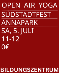 Gemeinsam in den Flow kommen– das ist das Ziel bei dieser offenen Yoga-Session mitten auf dem Südstadtfest am 5.7 um 11 Uhr. Drei Yogatrainer:innen, drei Stile – beweg dich durch fließende, kraftvolle und ruhige Sequenzen. Yoga tut gut, macht den Kopf frei und ist kostenlos. Komm einfach vorbei! Präsentiert vom Bildungszentrum Nürnberg, Fachteam Gesundheitsbildung. Matte oder großes Handtuch mitbringen |